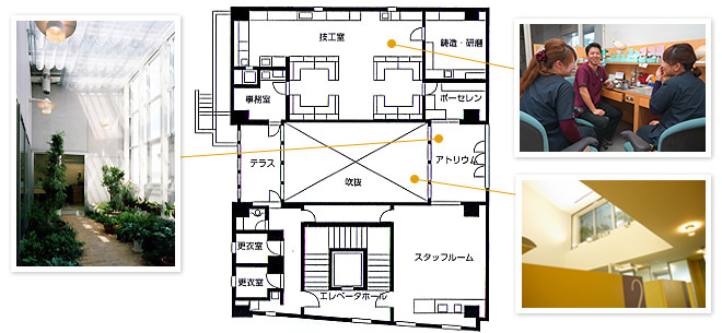 上階に技工室があります。また吹き抜けやテラスがあり、リラックスできる空間です。